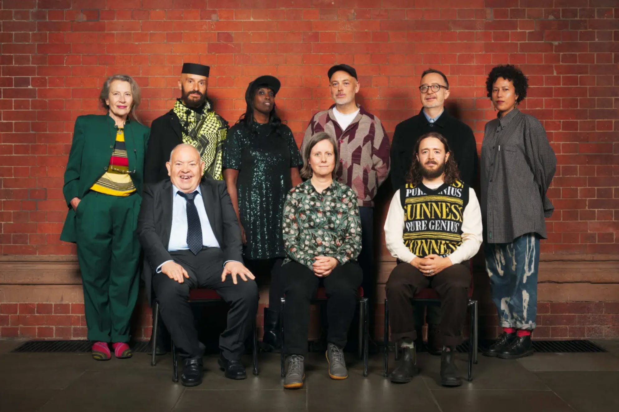 Awards for Artists 2024 recipients. Back row L R: Anne Bean, Mikhail Karikis, Grace Ndiritu, Aidan O’Rourke, Andrew Hamilton, Auclair. Front L R: Barry Anthony Finan, Rachel Musson, Sean Roy Parker. (Mark Sanders not present). Photo credit: Emile Holba