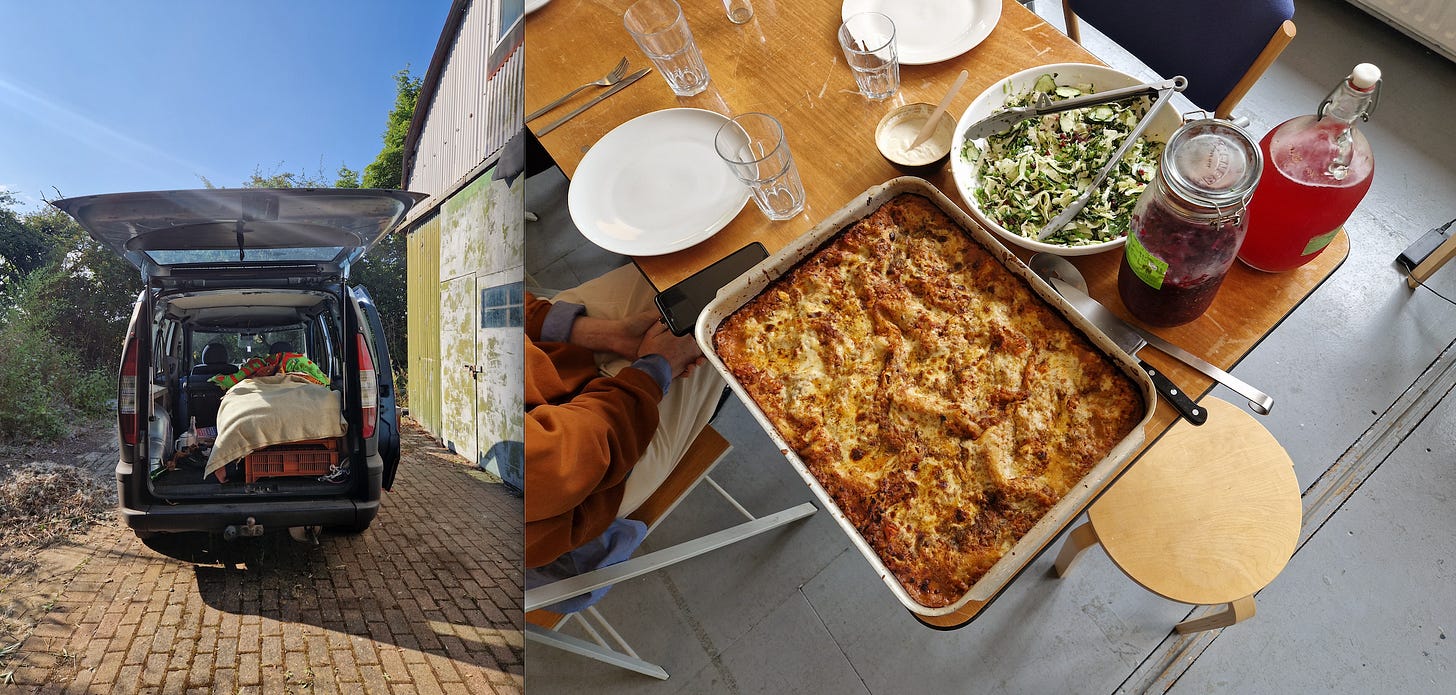 Back in England, I parked up in Doris the Doblo to perform the self-designated role of Ornamental Hermit at Wysing Arts Centre, made possible by the kind staff, and made bearable by access to a commercial kitchen I was allowed to commandeer. At least I could make ferments and cook nourishing food while everything else was spinning out. Most weeks I put on a free veggie lunch for all staff, studio holders and residents on site as a way of saying thank you.